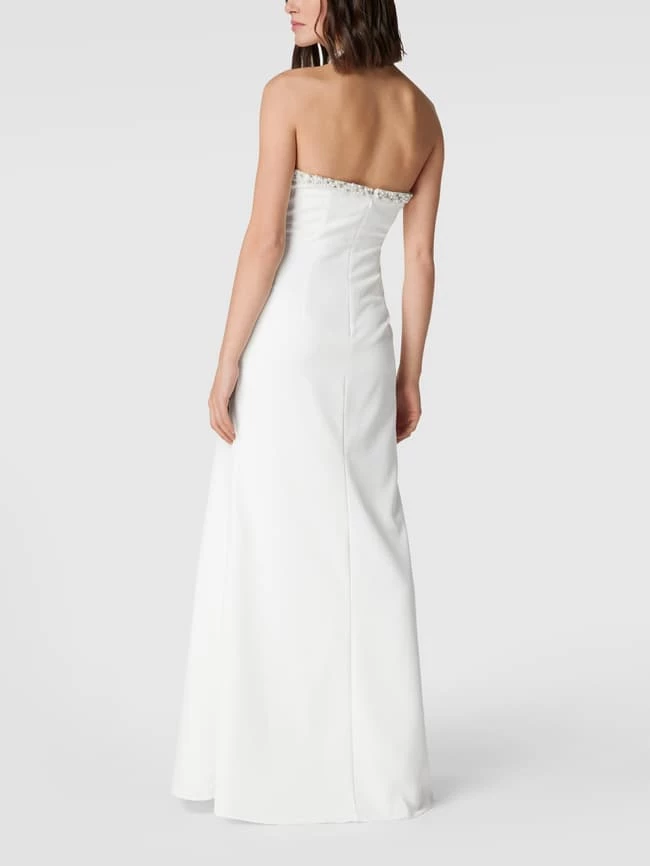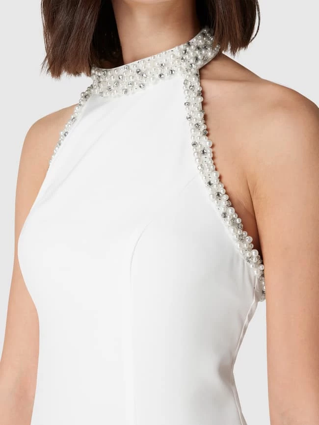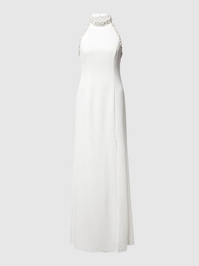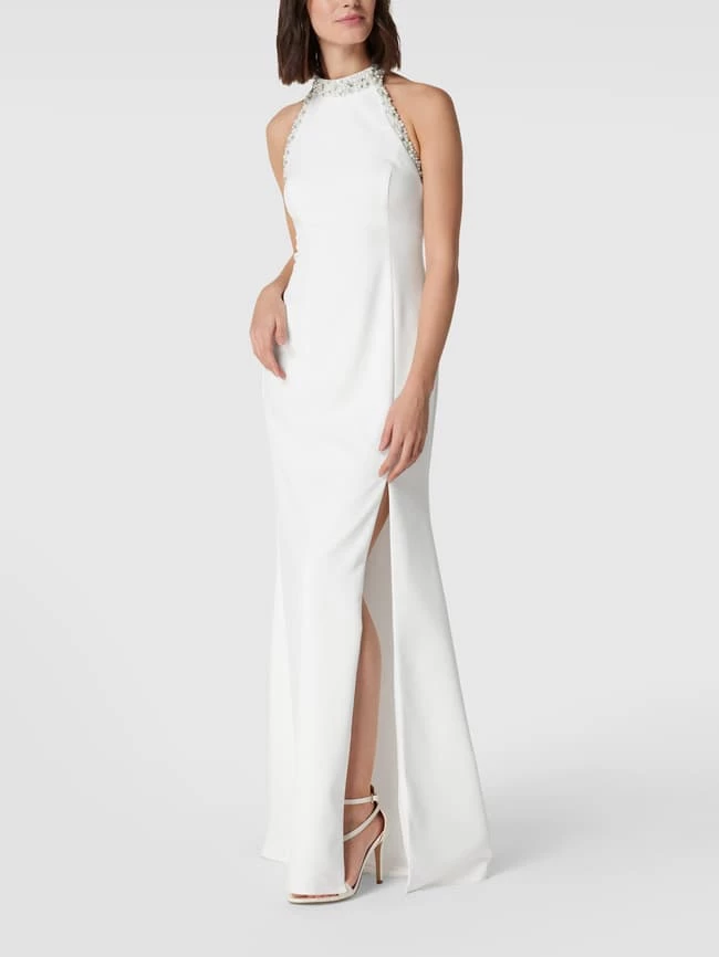 Das Brautkleid von Adrianna Papell ist aus einem elastischen Material-Mix gefertigt und körpernah geschnitten. Es kommt mit Neckholder, Seitenschlitz und Zierperlen und -steinen.