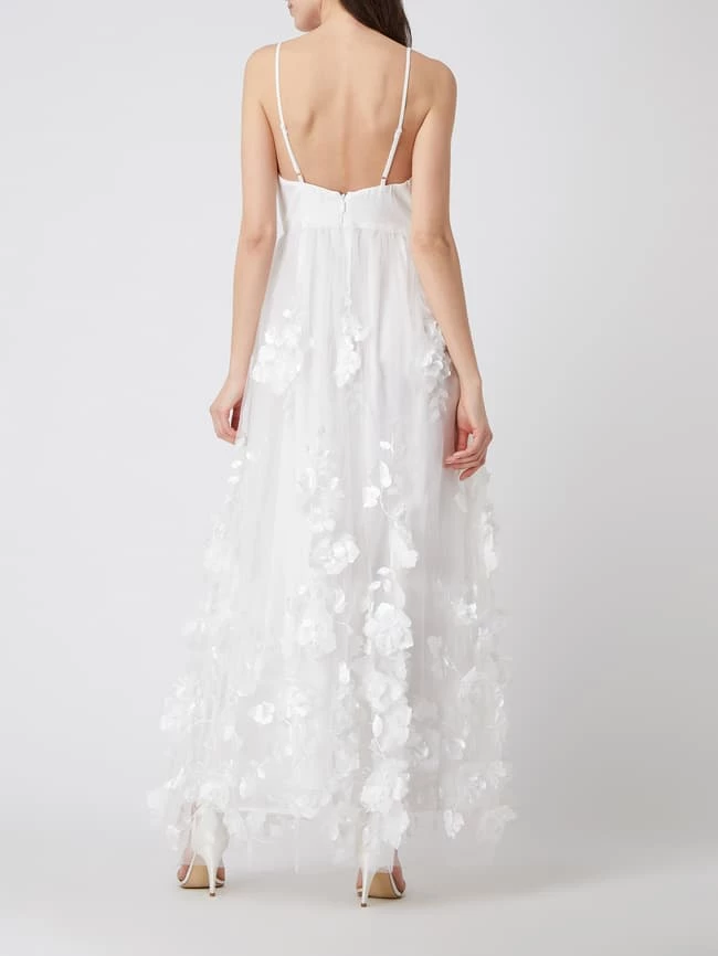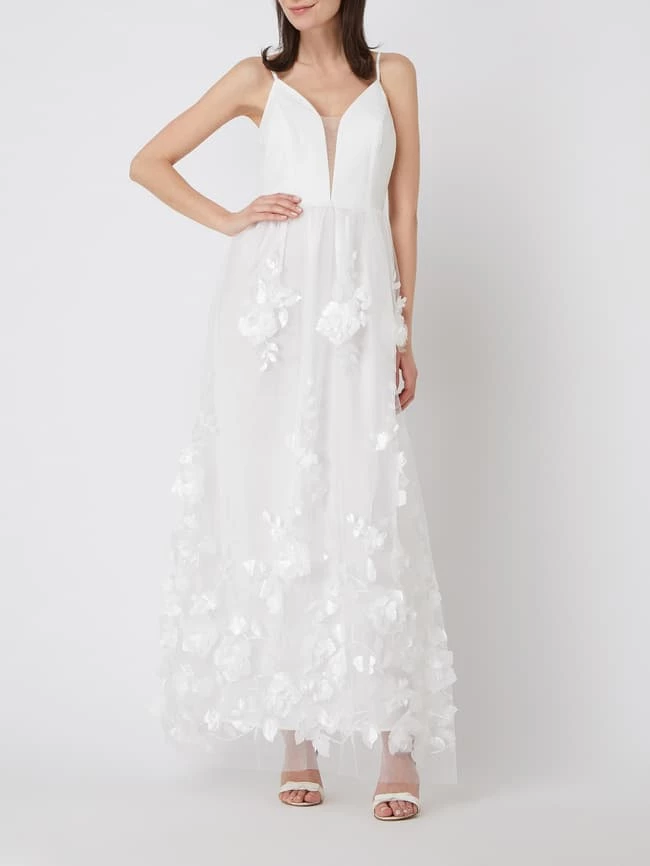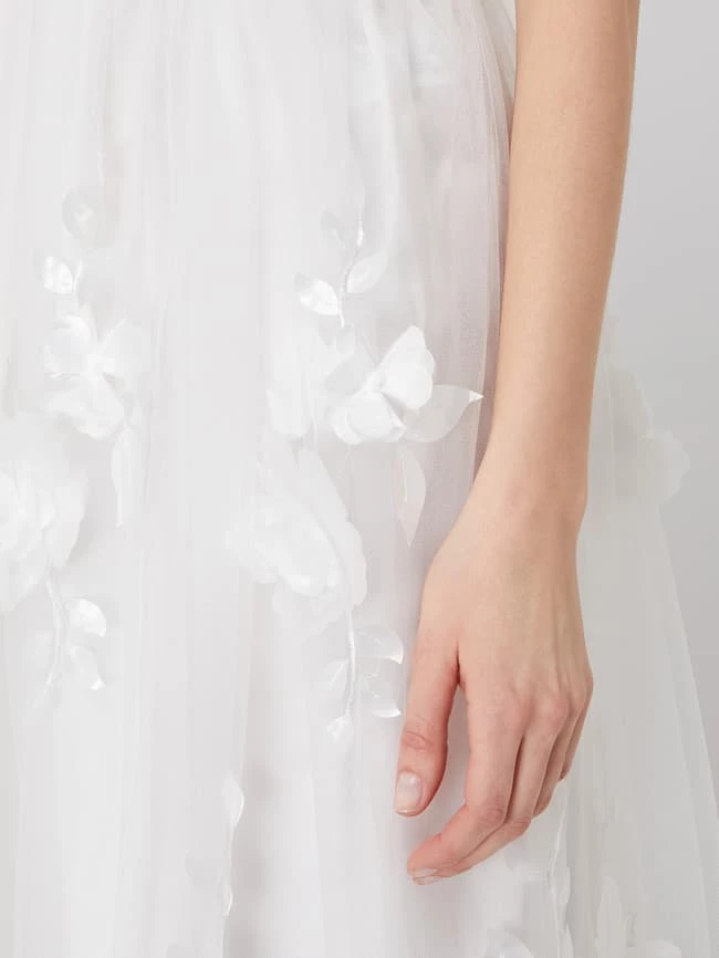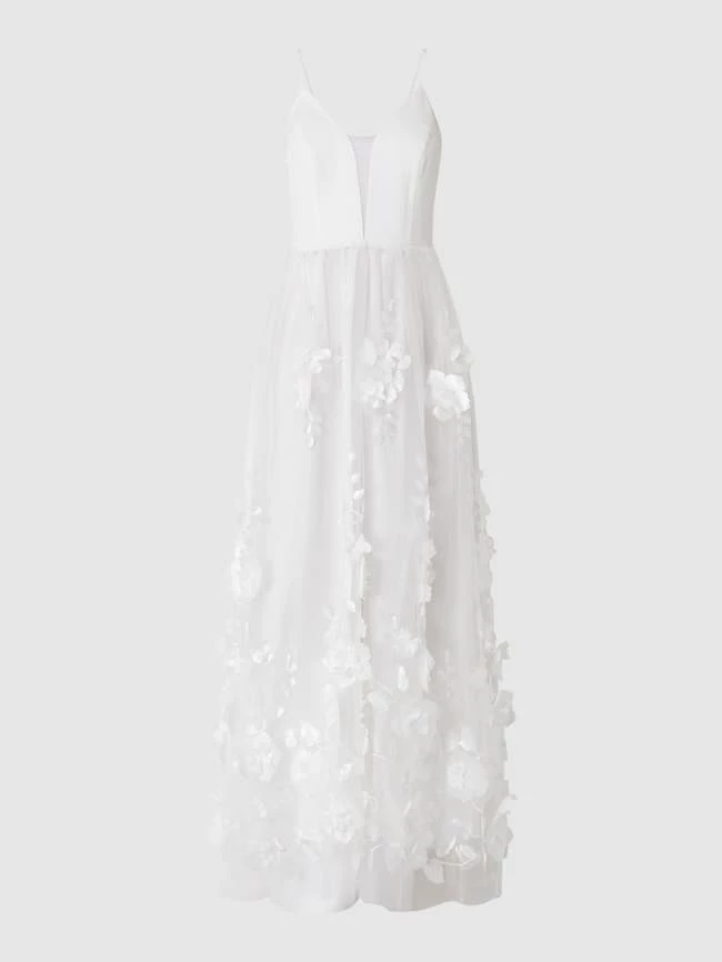 Das Brautkleid von Apart Glamour ist aus leichtem Material gefertigt und tailliert geschnitten. Es kommt mit Herz-Ausschnitt, ausgestelltem Rockteil und Blüten-Applikationen.