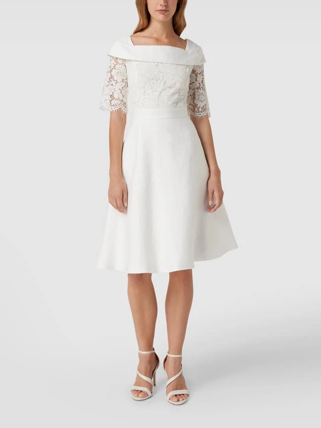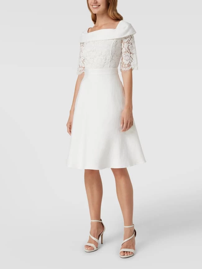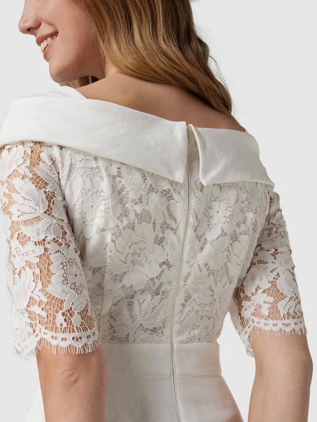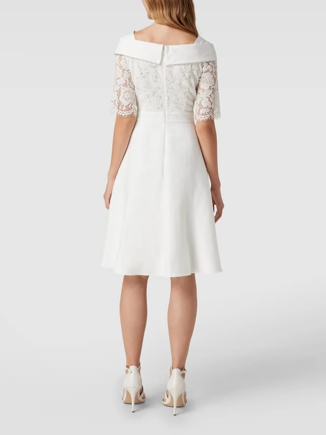 Das Brautkleid von Apart Glamour ist aus strapazierfähigem Material gefertigt und tailliert geschnitten. Es kommt mit kurzen Ärmeln, floralen Stickereien, Taillenpasse sowie U-Boot-Ausschnitt mit Krempe.