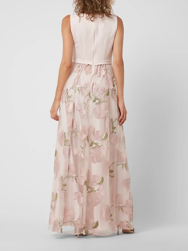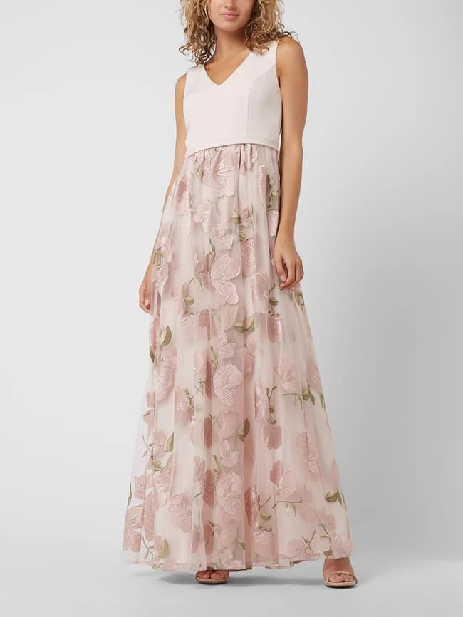Das Abendkleid von Christian Berg Cocktail ist aus leichtem Material gefertigt. Es zeigt sich in taillierter Passform mit V-Ausschnitt, Rockteil aus Tüll und floralen Stickereien.