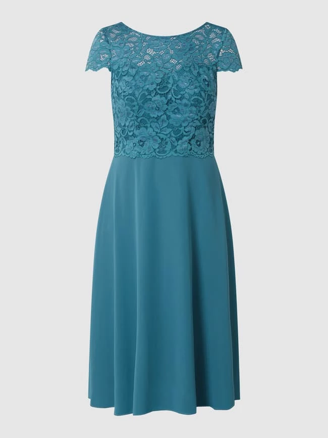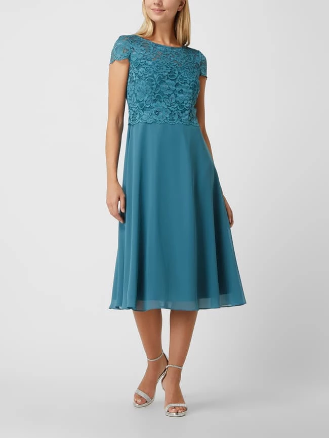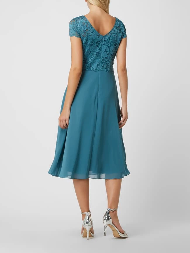 Das Cocktailkleid von Christian Berg Cocktail ist aus floraler Spitze und Chiffon gefertigt. Es zeigt sich in taillierter Passform mit kurzen Ärmeln und tiefem Rückenausschnitt.