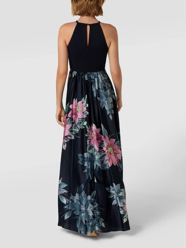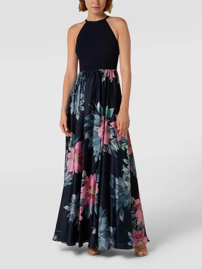 Das Abendkleid von Jake*s Cocktail ist aus einem Viskose-Mix mit Stretch-Anteil gefertigt und ausgestellt geschnitten. Es kommt mit amerikanischem Ausschnitt und Allover-Muster.