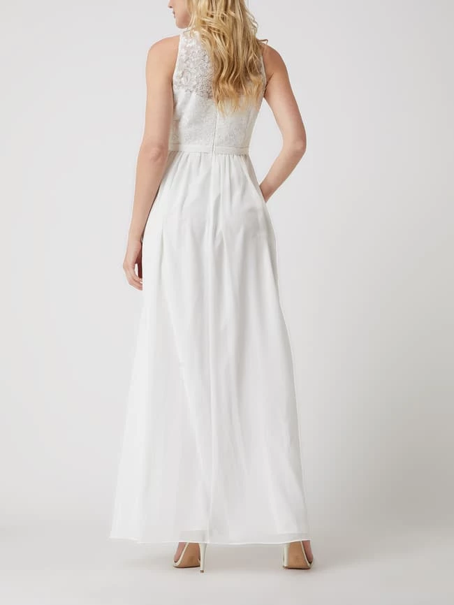 Das Brautkleid von Jake*s Cocktail ist aus Spitze und Chiffon gefertigt. Es zeigt sich in taillierter Passform mit Pailletten, Zierperlen und Nahtreißverschluss auf der Rückseite.