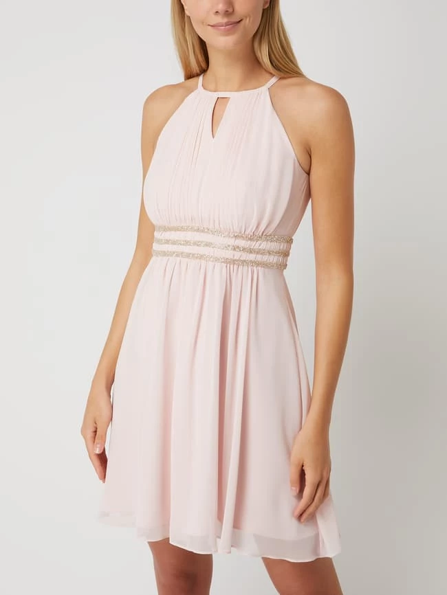Das Cocktailkleid von Jake*s Cocktail ist aus Chiffon gefertigt. Es zeigt sich in taillierter Passform mit Collierkragen, Zierperlen und gelegten Falten.