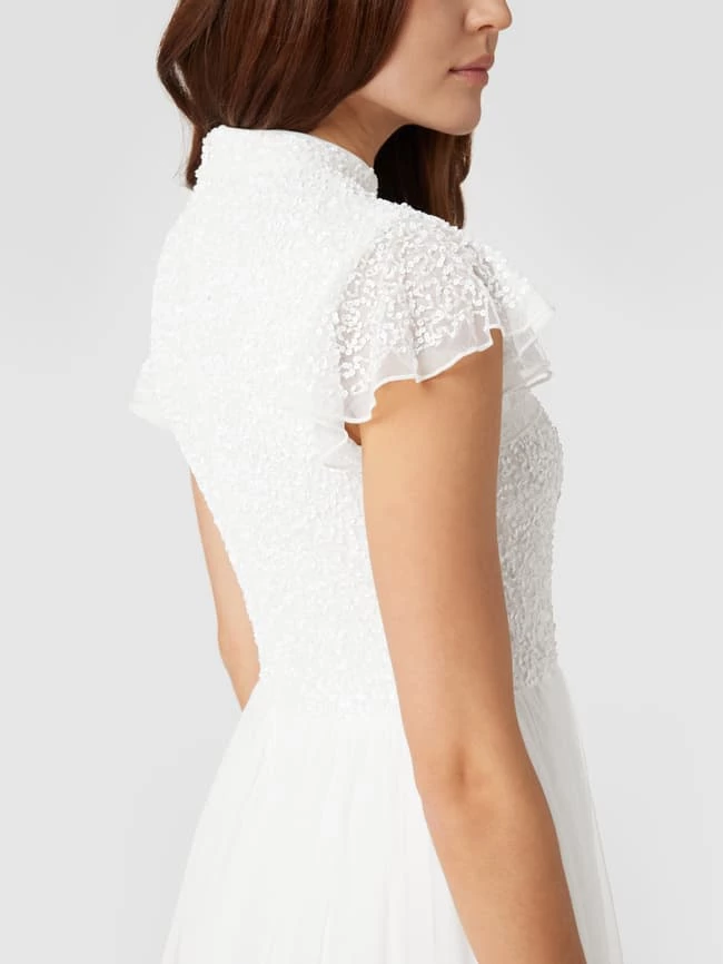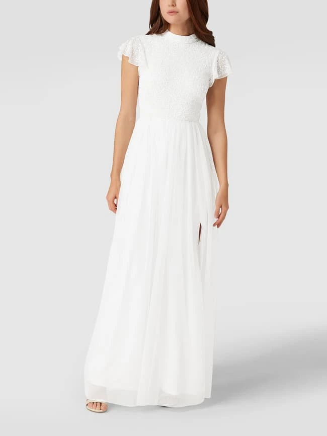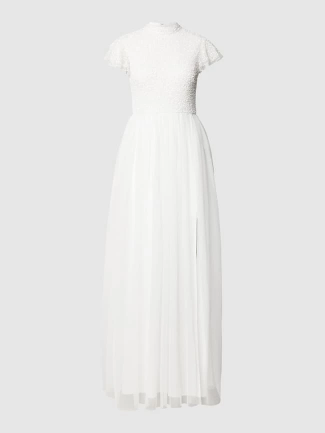 Das Brautkleid von Lace & Beads ist aus strapazierfähigem Material gefertigt und tailliert geschnitten. Es kommt mit Stehkragen, Paillettenbesatz und Seitenschlitz sowie ausgestellter Rockpartie.