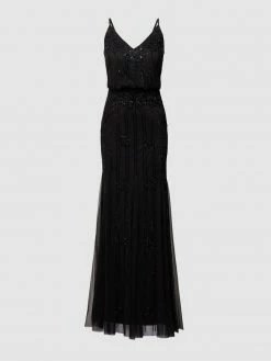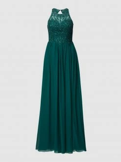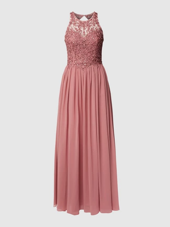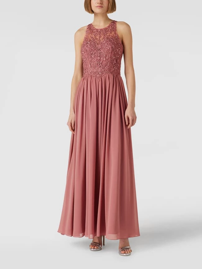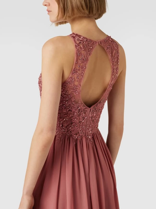 Das Abendkleid von LAONA ist aus strapazierfähigem Material gefertigt und tailliert geschnitten. Es zeigt sich mit amerikanischem Ausschnitt, floralen Stickereien und Zierperlen.