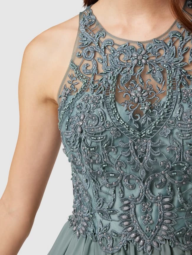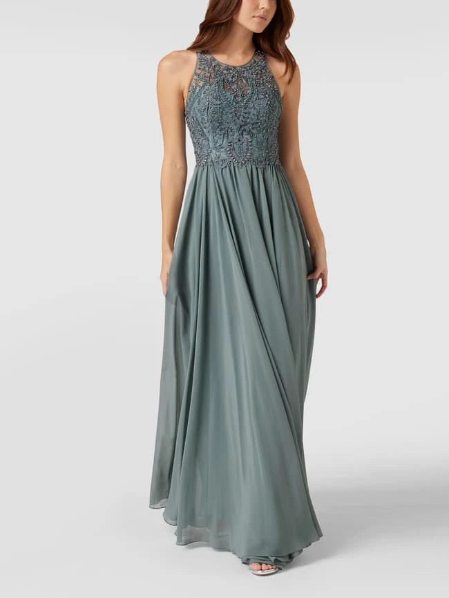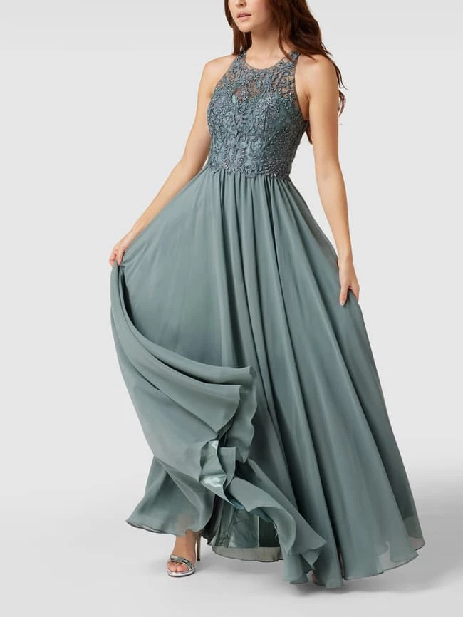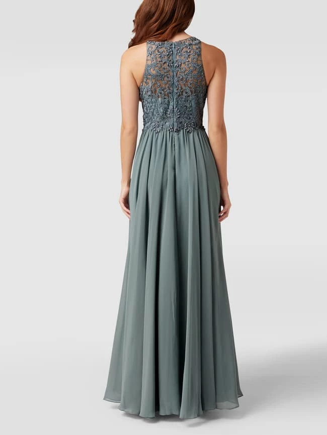 Das Abendkleid von LAONA ist aus Tüll gefertigt und tailliert geschnitten. Es kommt mit Strasssteinen, floraler Spitze, Nahtreißverschluss am Rücken und Rundhalsausschnitt.