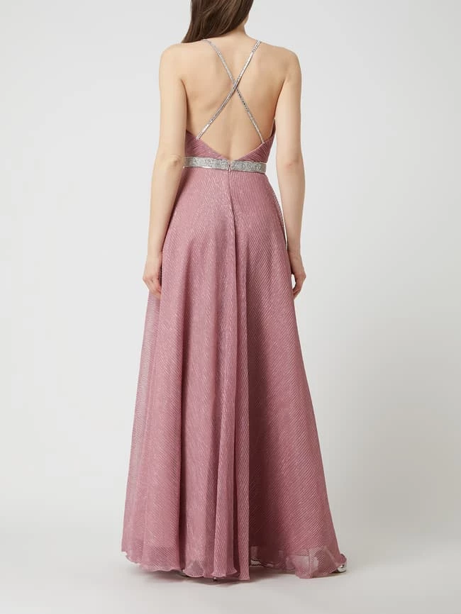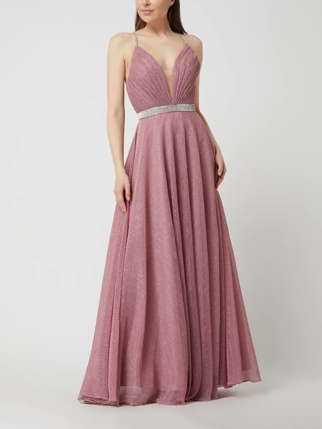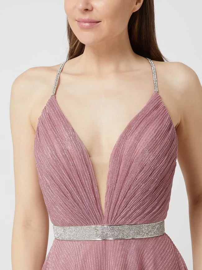 Das Abendkleid von LUXUAR LIMITED ist aus Mesh gefertigt und tailliert geschnitten. Es zeigt sich mit Plisseefalten, funkelnden Spaghettiträgern und Strasssteinen.