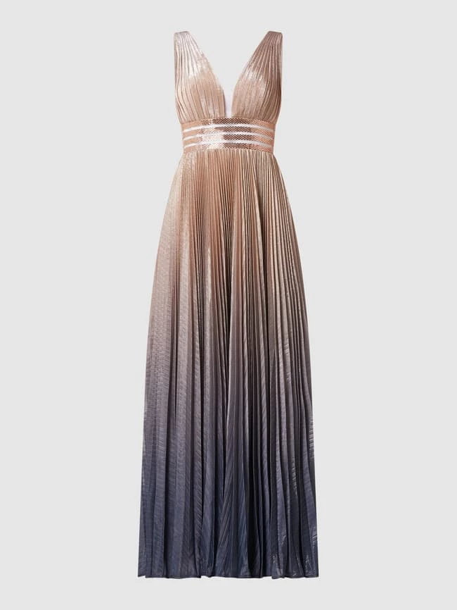 Das Abendkleid von LUXUAR LIMITED ist aus Krepp gefertigt. Es zeigt sich in taillierter Passform mit Farbverlauf, Plisseefalten und tiefem Herz-Ausschnitt.