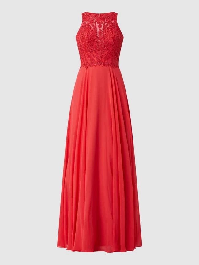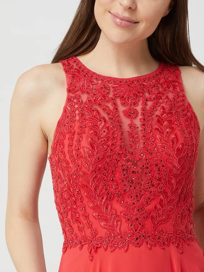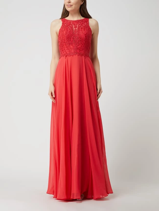 Das Abendkleid von LUXUAR LIMITED ist aus Tüll und Chiffon gefertigt. Es zeigt sich in taillierter Passform mit Stickereien, Strasssteinen und Nahtreißverschluss auf der Rückseite.