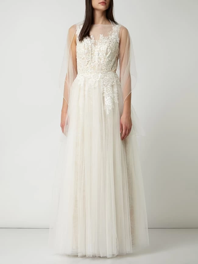 Das Brautkleid von LUXUAR MAGIC BRIDE ist aus Mesh gefertigt und tailliert geschnitten. Es kommt mit floralen Stickereien, Pailletten-Applikationen und mehrlagigem Rockteil.