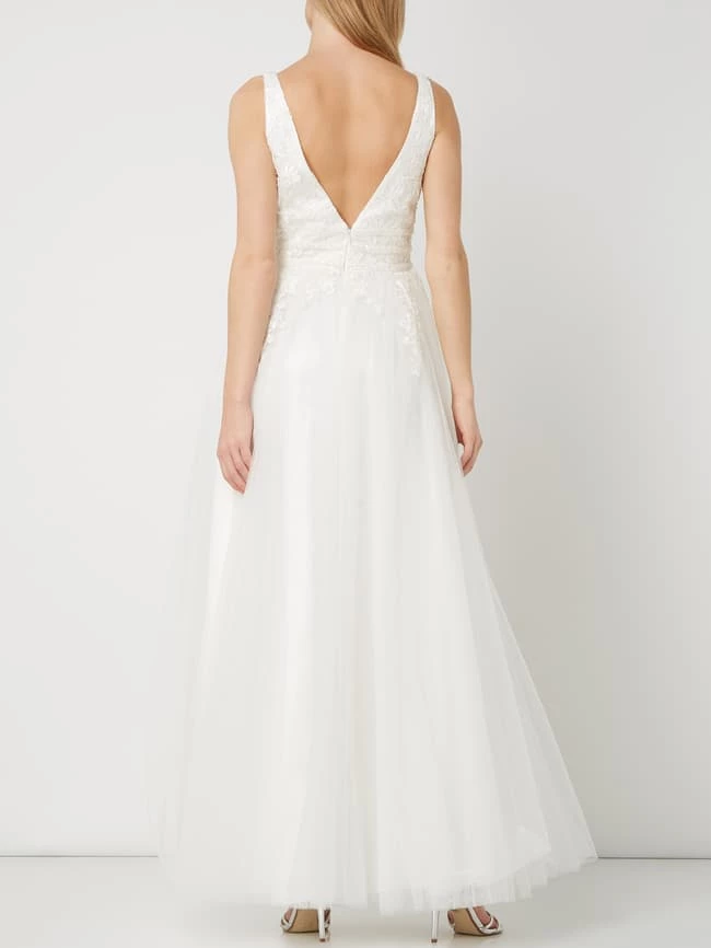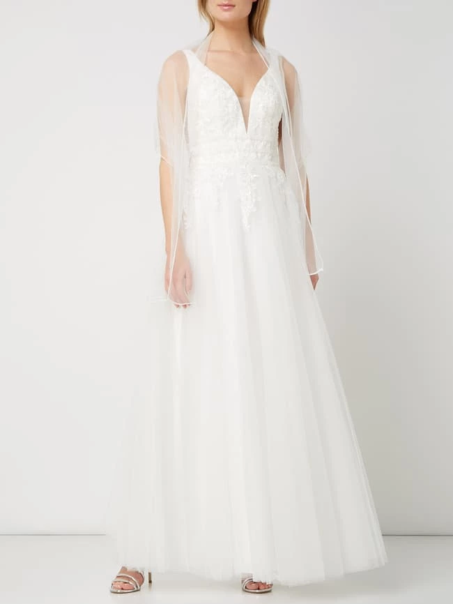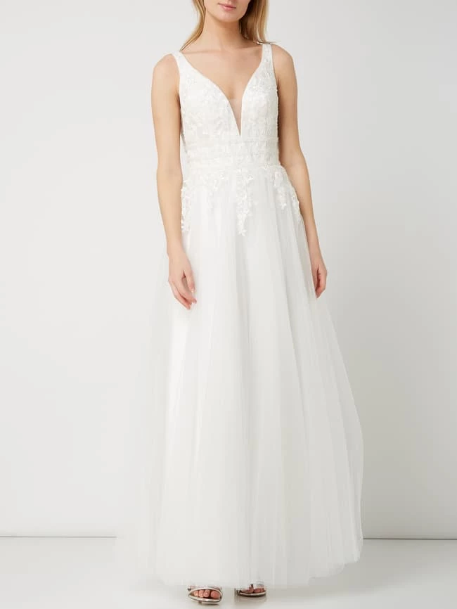 Das Brautkleid von LUXUAR MAGIC BRIDE ist aus Mesh gefertigt und tailliert geschnitten. Es kommt mit Glitter-Effekt, floralen Stickereien und mehrlagigem Rockteil.