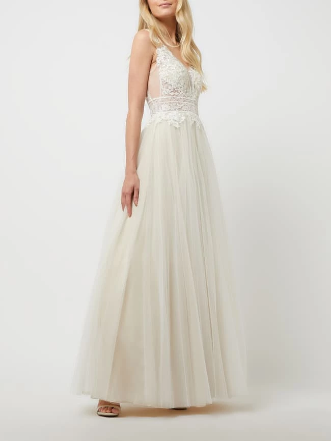 Das Brautkleid von LUXUAR MAGIC BRIDE ist aus Spitze und Tüll gefertigt. Es zeigt sich in taillierter Passform mit schmalen Trägern, Zierperlen und weit ausgestelltem Rockteil.