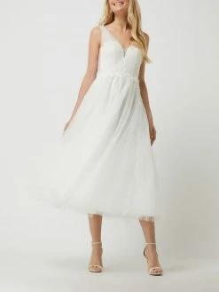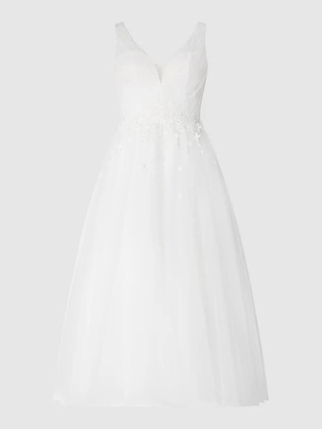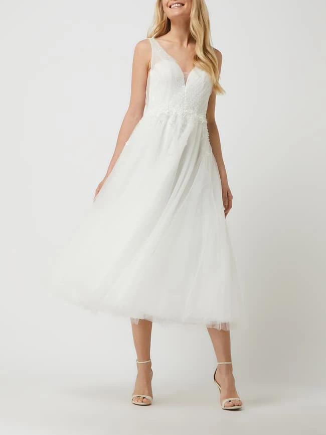 Das Brautkleid von LUXUAR MAGIC BRIDE ist aus Tüll gefertigt und tailliert geschnitten. Es zeigt sich in Midilänge mit Plisseefalten, Blüten-Applikationen und mehrlagigem Rockteil.