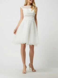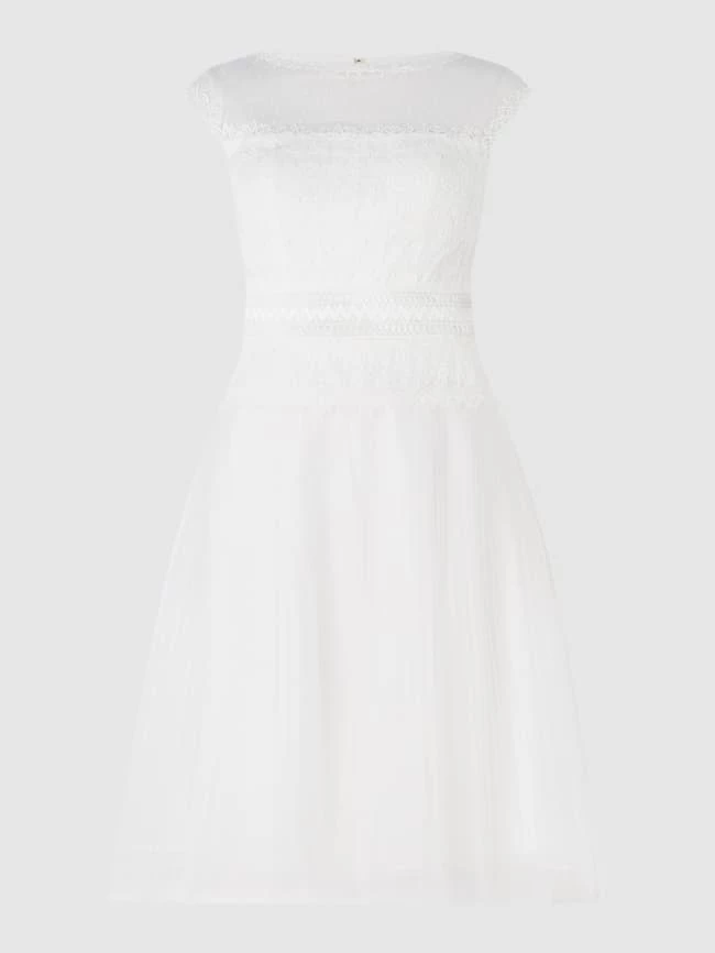 Das Brautkleid von LUXUAR MAGIC BRIDE ist aus Tüll gefertigt und tailliert geschnitten. Es zeigt sich mit Zierborten aus Spitze, plissiertem Rockteil und Zierperlen auf der Rückseite.