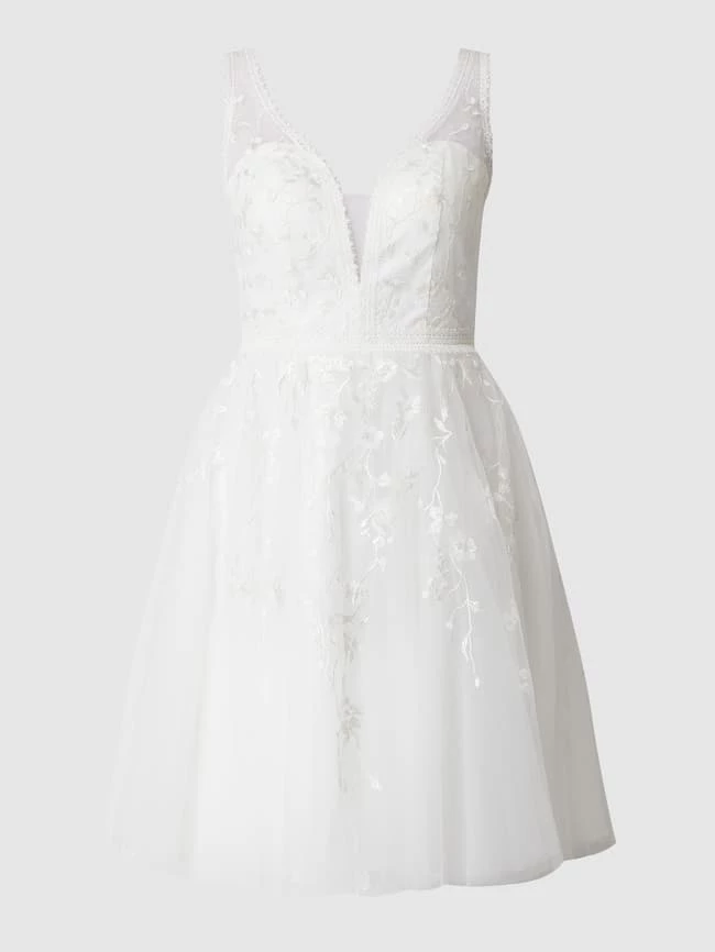 Das Brautkleid von LUXUAR MAGIC BRIDE ist aus Tüll gefertigt und kommt in taillierter Passform. Es zeigt sich mit floralen Stickereien, tiefem Herz-Ausschnitt und breiten Trägern.