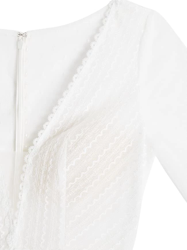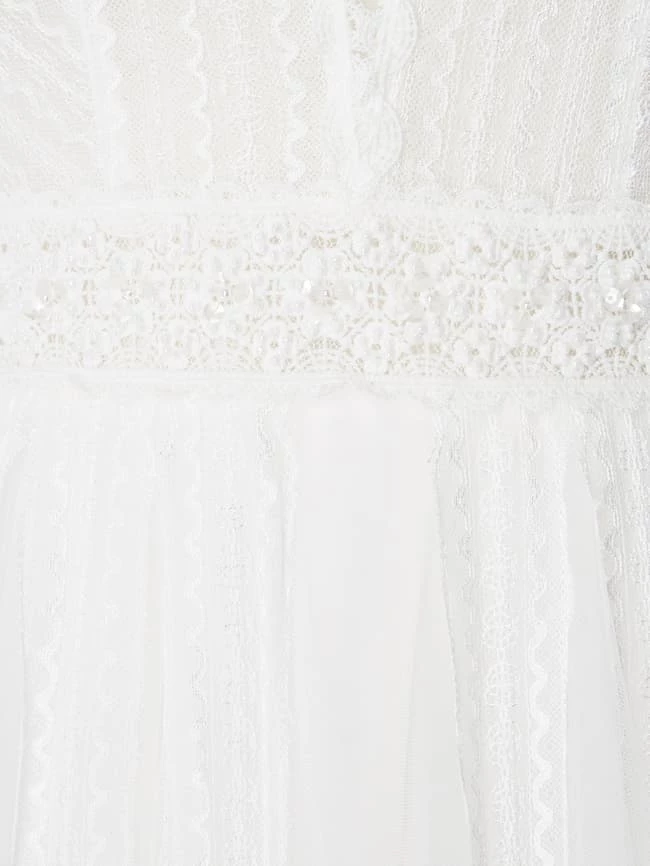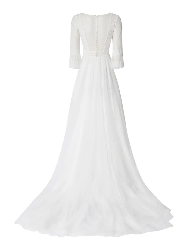 Das Brautkleid von LUXUAR MAGIC BRIDE ist aus Tüll gefertigt und kommt in taillierter Passform. Es zeigt sich mit 3/4-Arm, Zierborten aus Spitze und langer Schleppe. Das Brautkleid eignet sich perfekt für eine Hochzeit im Boho-Stil.