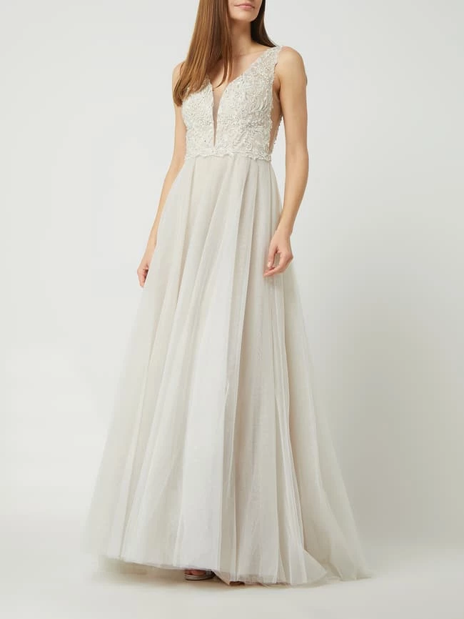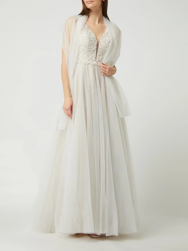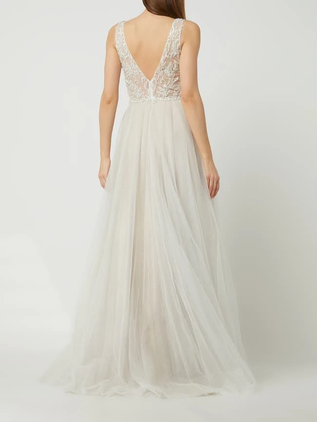 Das Brautkleid von LUXUAR MAGIC BRIDE ist aus Tüll gefertigt und tailliert geschnitten. Es kommt mit floralen Stickereien, Herz-Ausschnitt und ausgestelltem Rockteil.