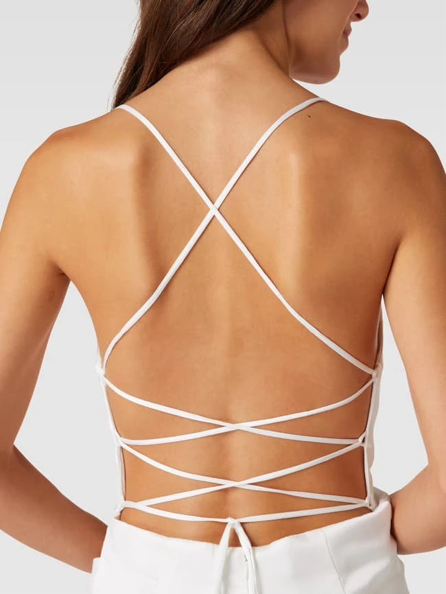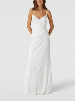 Das Brautkleid von LUXUAR FASHION ist aus einem strapazierfähigen Material gefertigt und körpernah geschnitten. Es zeigt sich in Wickel-Optik mit Spaghettiträgern.
