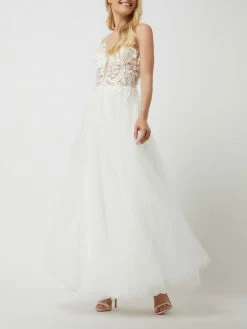 Das Brautkleid von LUXUAR ist aus Tüll gefertigt und tailliert geschnitten. Es zeigt sich mit floralen Stickereien, Pailletten und tiefem Rückenausschnitt.
