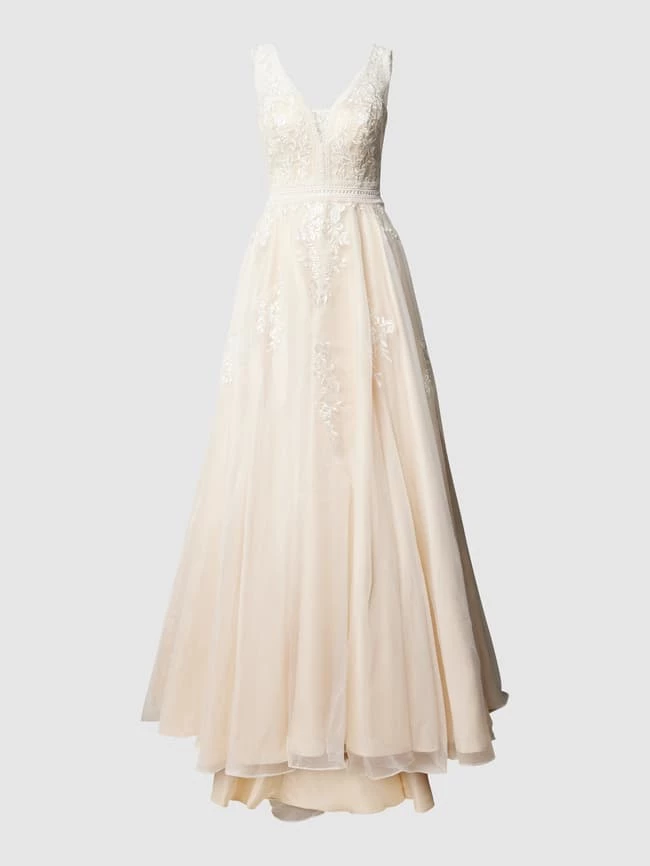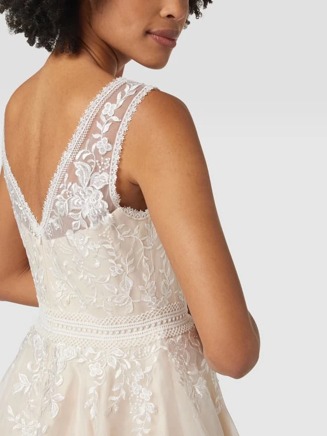 Das Brautkleid von LUXUAR FASHION ist aus strapazierfähigem Material gefertigt und tailliert geschnitten. Es kommt mit Taillenpasse aus Spitze, Herz-Ausschnitt und floralen Stickereien.