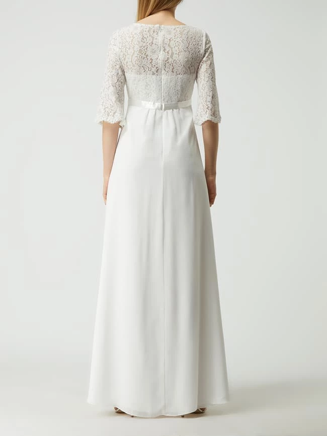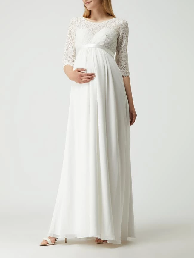 Das Umstandsbrautkleid von LUXUAR MAGIC BRIDE ist aus Spitze und Chiffon gefertigt. Es zeigt sich in taillierter Passform mit Rundhalsausschnitt, verkürzten Ärmeln und Details aus Satin.