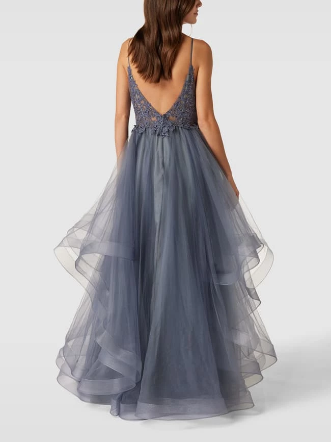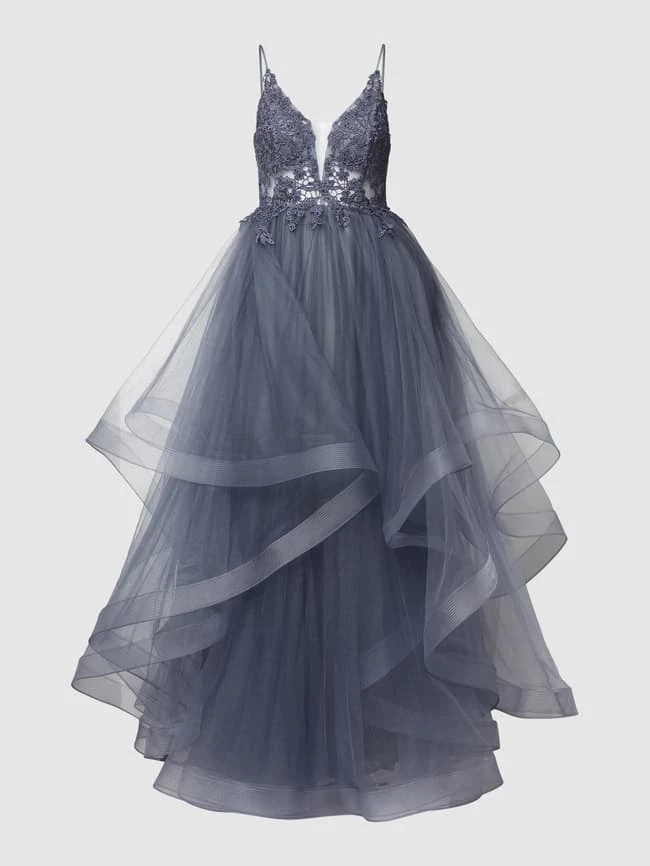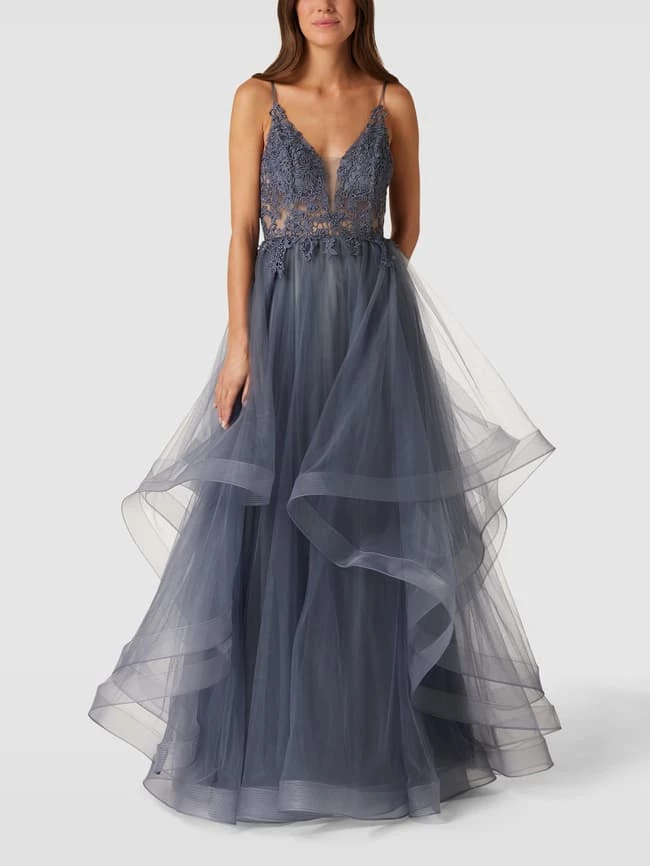 Das Abendkleid von Mascara ist aus einem strapazierfähigen Material gefertigt und tailliert geschnitten. Es zeigt sich mit Spaghettiträgern und florale Stickereien.