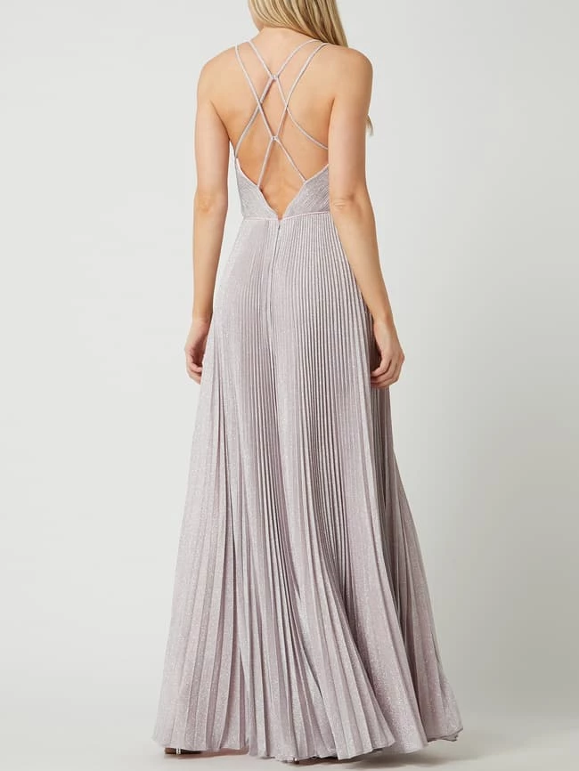 Das Abendkleid von Mascara ist aus leichtem Material gefertigt und tailliert geschnitten. Es zeigt sich mit Glitter-Effekt, gekreuzten Spaghettiträgern und Plisseefalten.