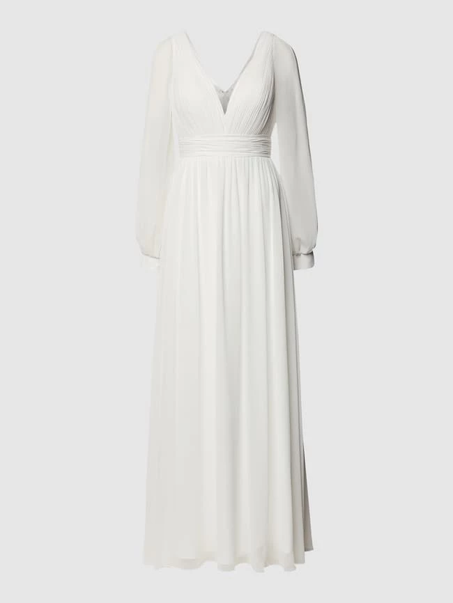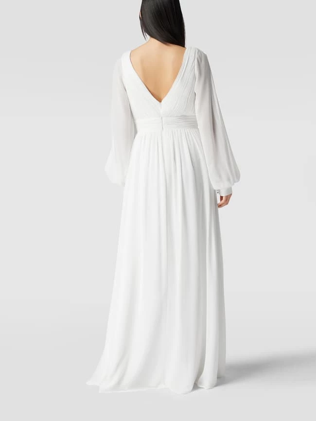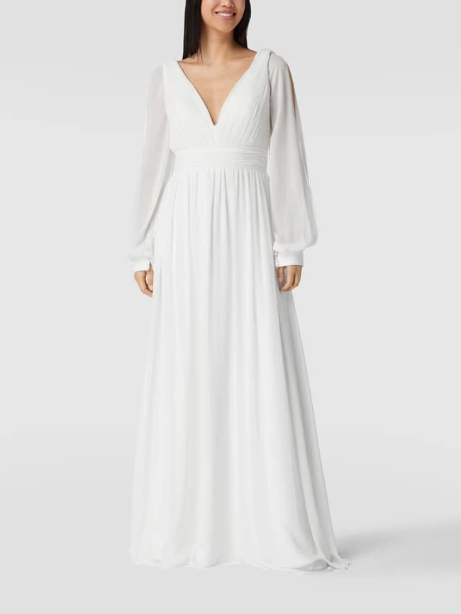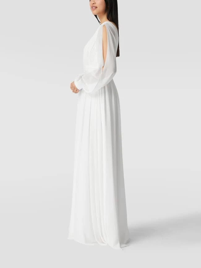 Das Brautkleid von Mascara ist aus strapazierfähigem Material gefertigt und tailliert geschnitten. Es kommt mit Taillenpasse und Oberteil mit Plisseefalten sowie transparenten Ärmeln mit Cut Out.