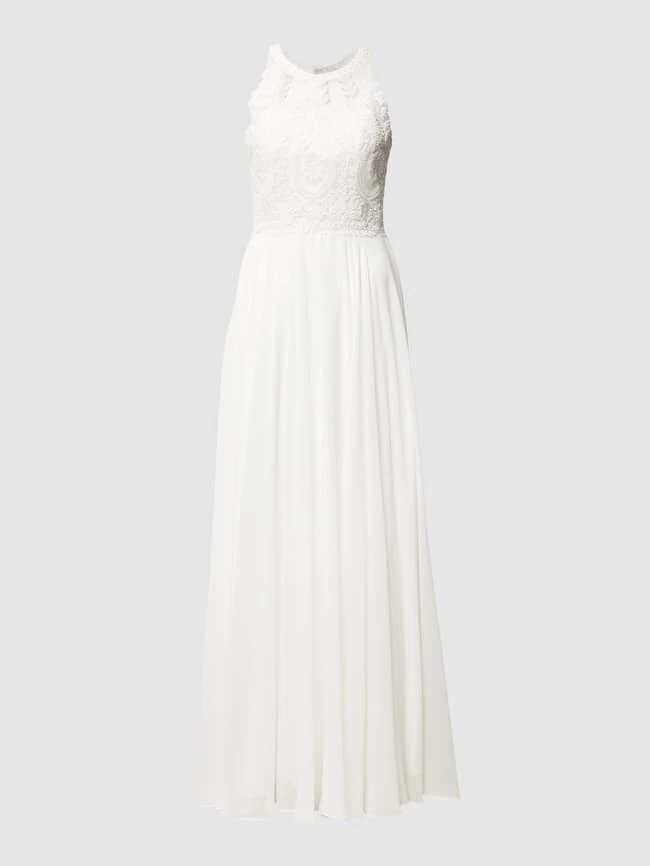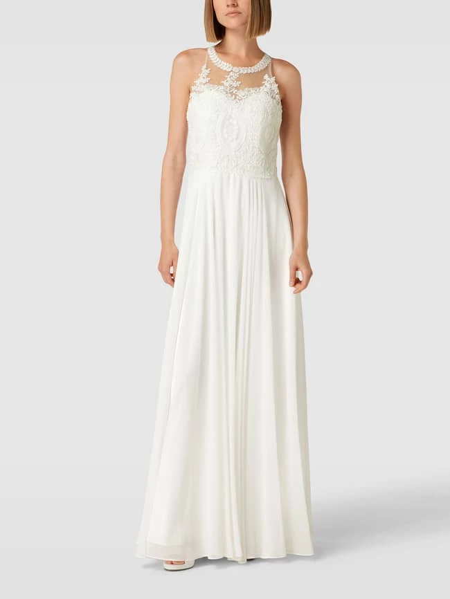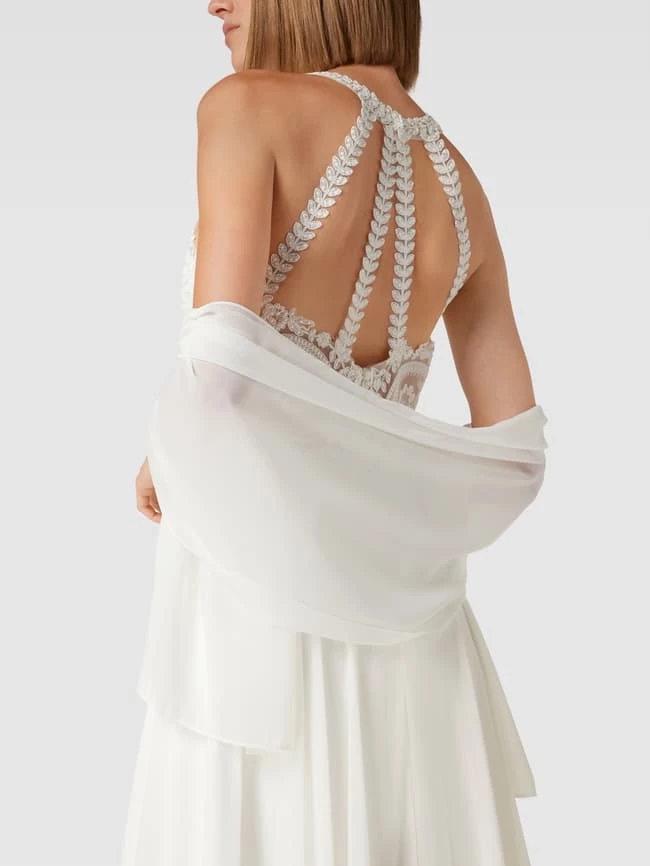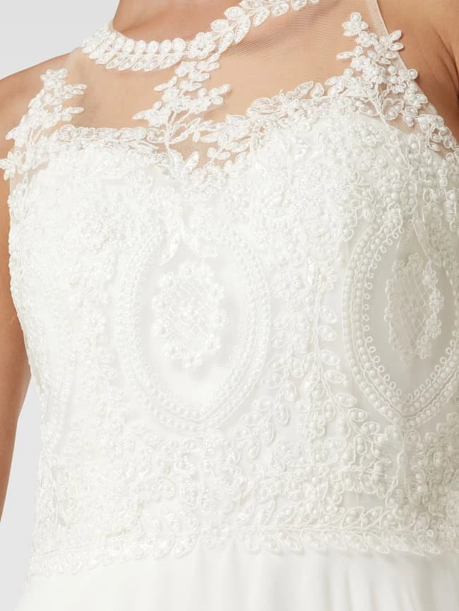 Das Brautkleid von Mascara ist aus strapazierfähigem Material gefertigt und tailliert geschnitten. Es kommt mit amerikanischem Ausschnitt, Zierbesatz und ausgestellter Rockpartie.