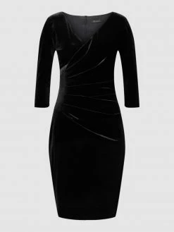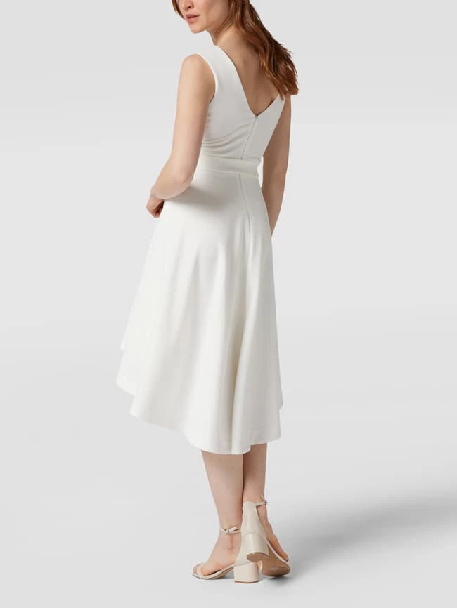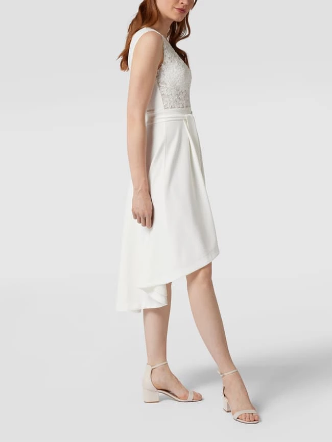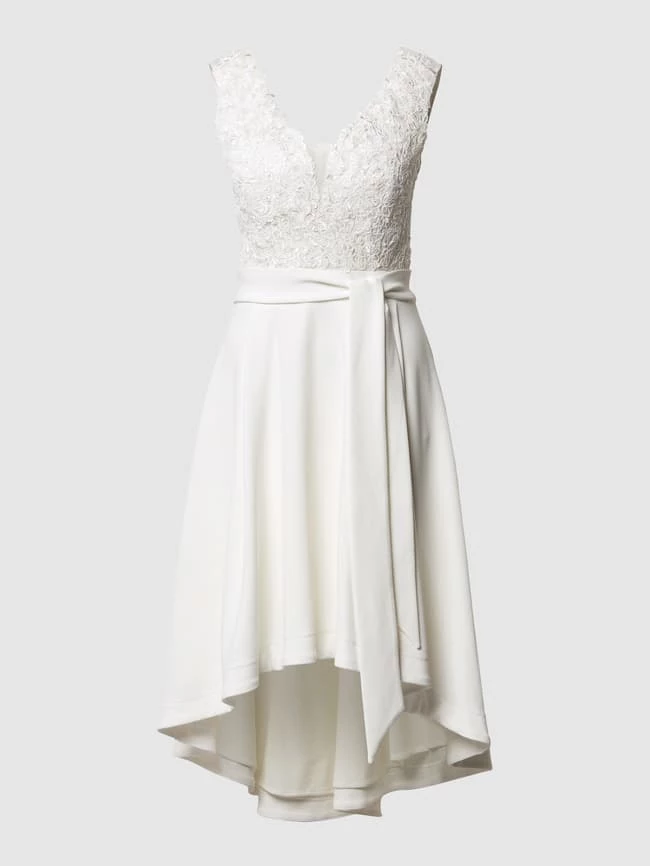 Das Brautkleid von Paradi ist aus einer Materialmischung mit Stretch-Anteil gefertigt und tailliert geschnitten. Es kommt mit V-Ausschnitt, floralen Stickereien und Taillenband.