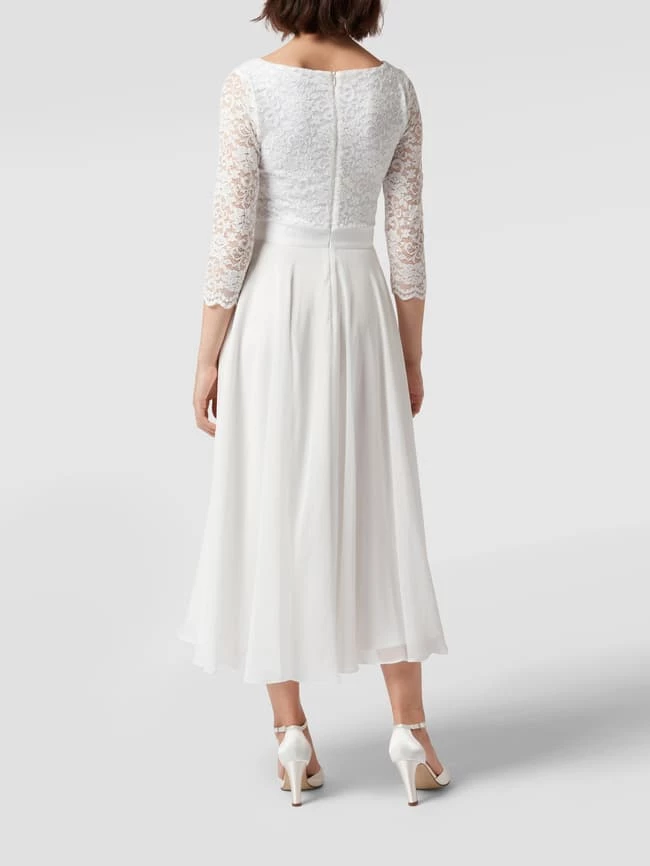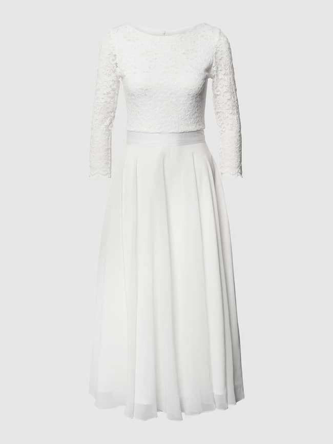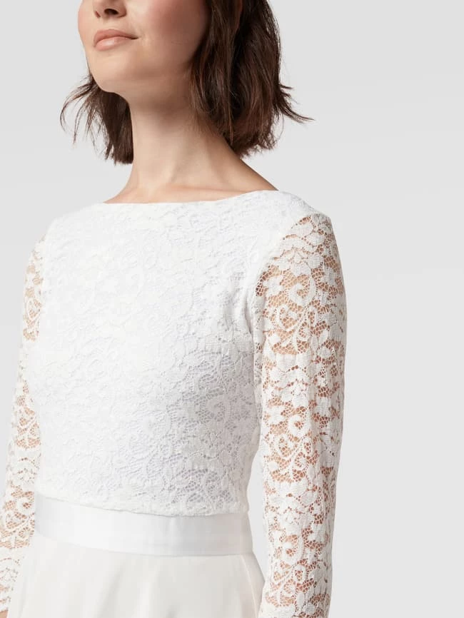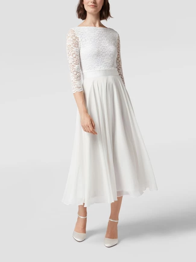 Das Brautkleid von SWING ist aus strapazierfähigem Material gefertigt und tailliert geschnitten. Es kommt mit floralen Stickereien, Taillenpasse sowie doppellagigem Rockteil.