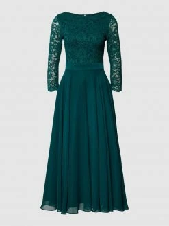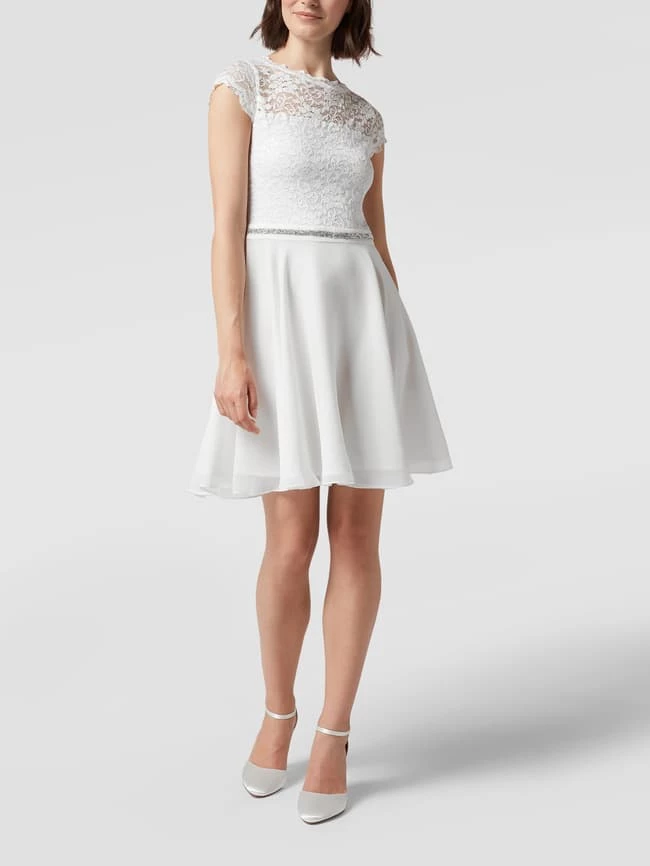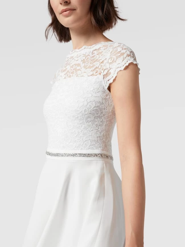 Das Brautkleid von SWING ist aus strapazierfähigem Material gefertigt und tailliert geschnitten. Es kommt mit kurzen Ärmeln, floralen Stickereien, Taillenpasse mit Ziersteinen sowie doppellagigem Rockteil.