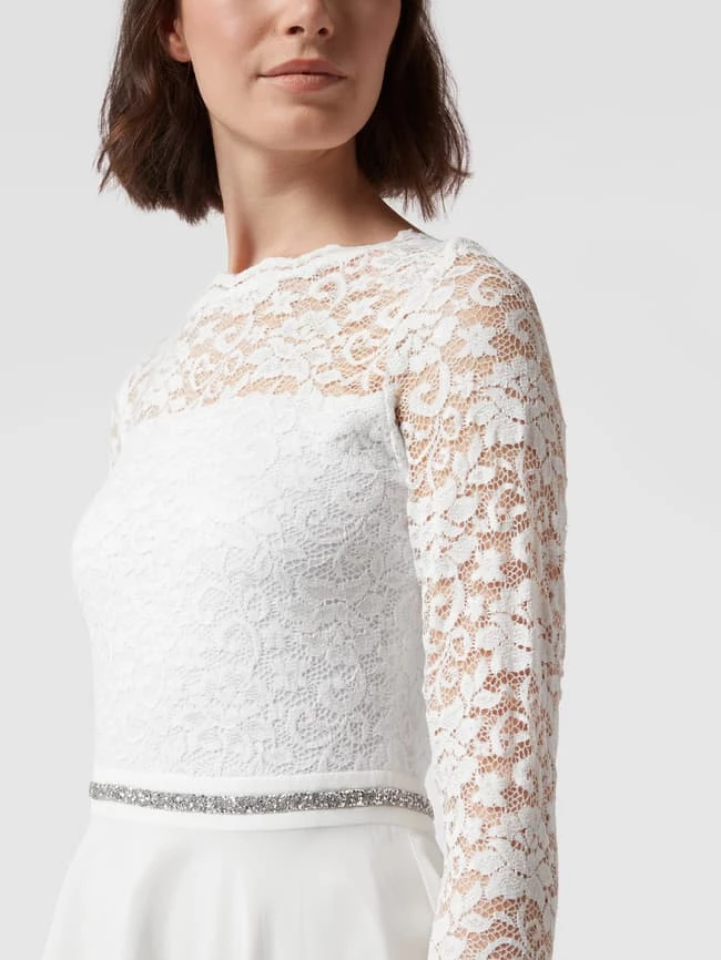 Das Brautkleid von SWING ist aus strapazierfähigem Material gefertigt und tailliert geschnitten. Es kommt mit langen Ärmeln, floralen Stickereien, Taillenpasse mit Ziersteinen sowie doppellagigem Rockteil.