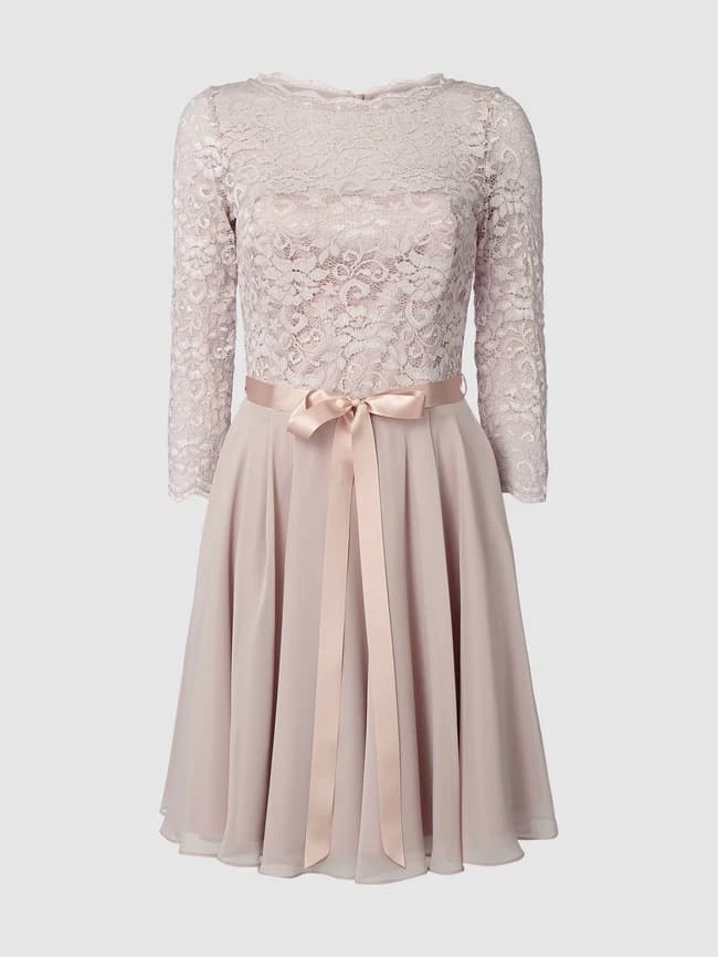 Das Brautkleid von SWING ist aus strapazierfähigem Material gefertigt und tailliert geschnitten. Es kommt mit floraler Spitze, Taillenband und ausgestellter Rockpartie sowie Rundhalsausschnitt.