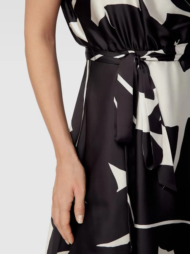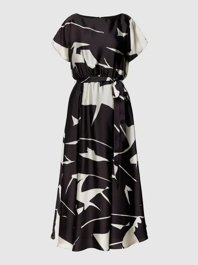 Das Cocktailkleid von SWING ist aus einem strapazierfähigen Material gefertigt und im taillierten Schnitt gehalten. Es zeigt sich mit Allover-Muster, U-Boot-Ausschnitt und Taillengürtel.