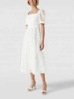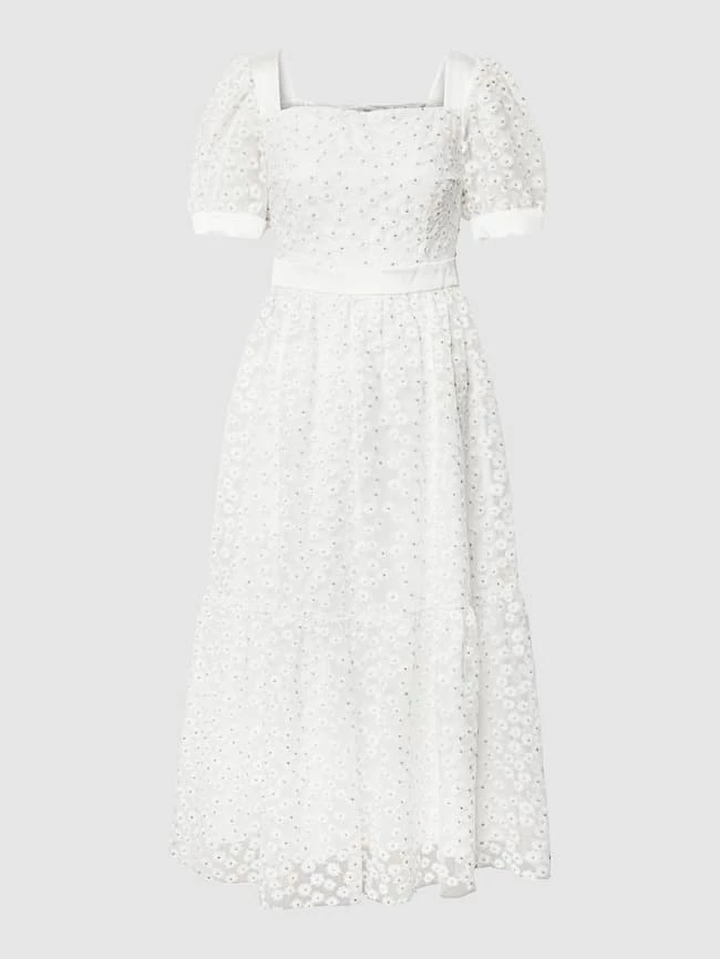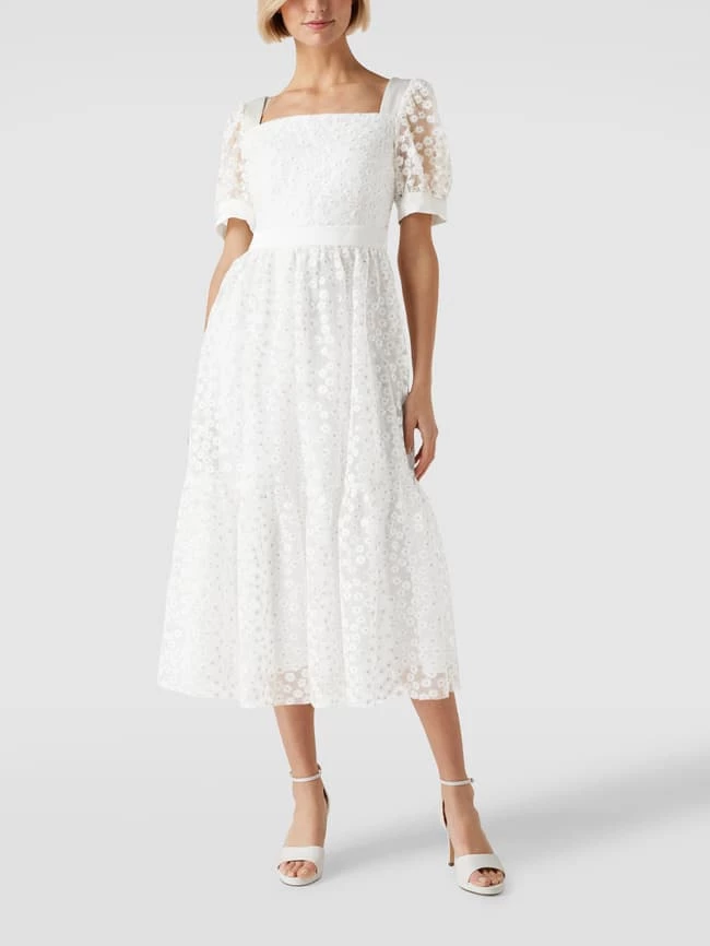Das Cocktailkleid von SWING ist aus strapazierfähigem Material gefertigt und tailliert geschnitten. Es kommt mit Puffärmeln, Karree-Ausschnitt sowie semitransparentem Oberstoff mit floralem Besatz.
