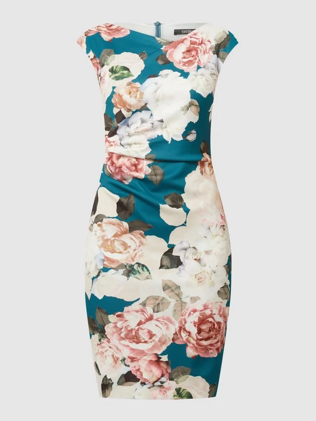Das Cocktailkleid von SWING ist aus einer Materialmischung mit Stretch-Anteil gefertigt. Es kommt mit floralem Muster, seitlicher Drapierung und kurzem Gehschlitz.