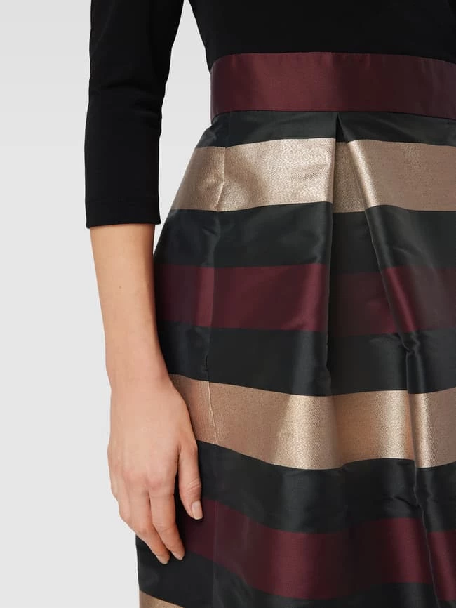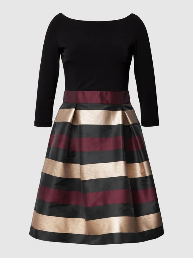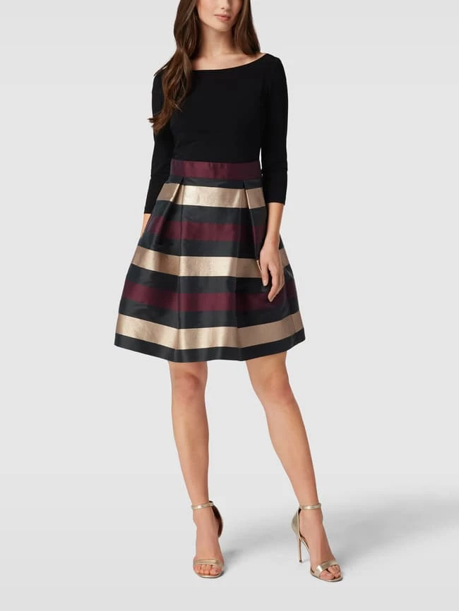 Das Cocktailkleid von SWING ist aus einem strapazierfähigen Material-Mix gefertigt und im taillierten Schnitt gehalten. Es zeigt sich mit Streifenmuster, U-Boot-Ausschnitt sowie 3/4-Ärmel.