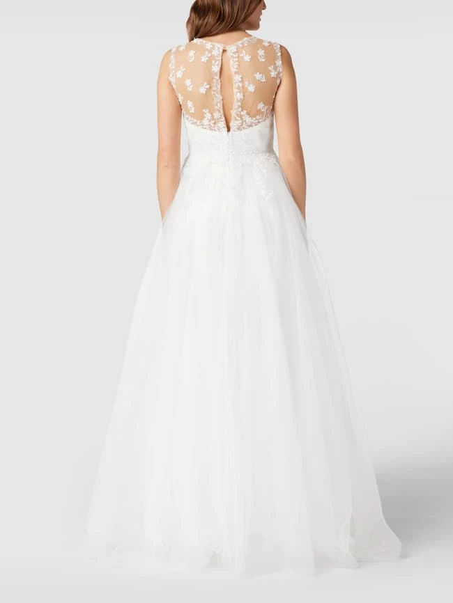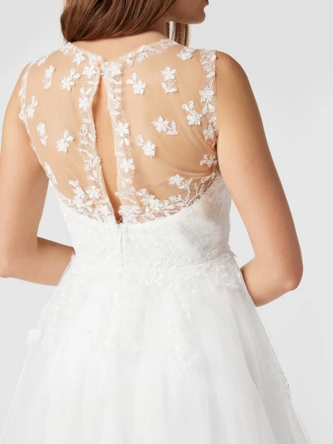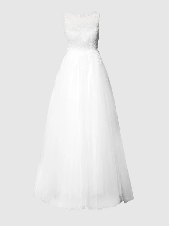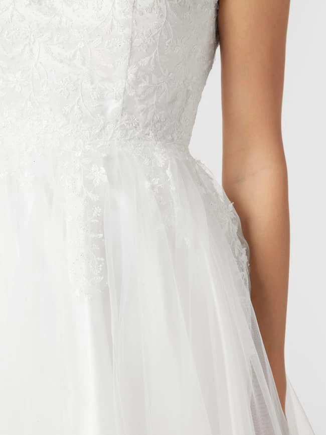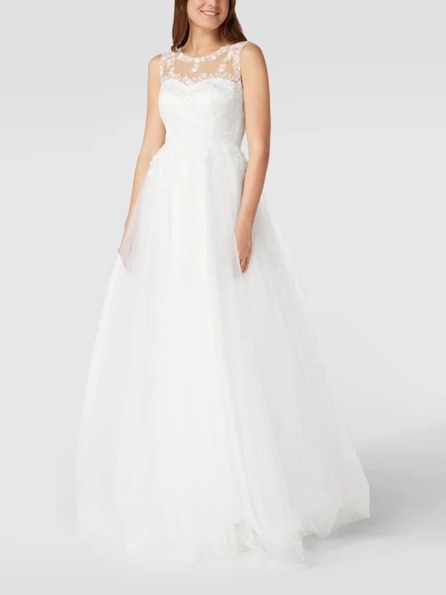 Das Brautkleid von TROYDEN COLLECTION ist aus strapazierfähigem Material gefertigt und tailliert geschnitten. Es zeigt sich im ärmellosen Design mit breiten Trägern, floralen Stickereien sowie mehrlagigem Rockteil.