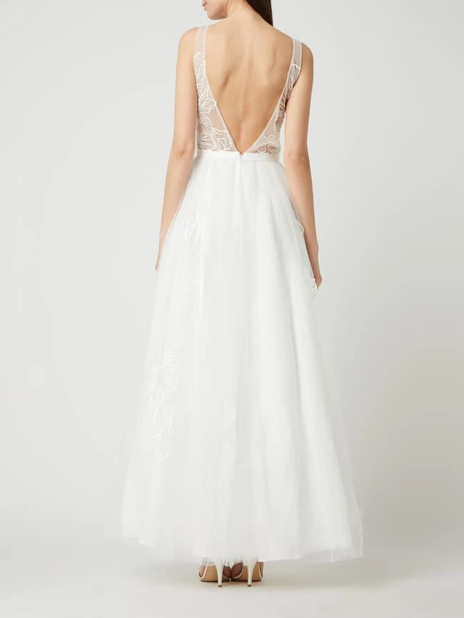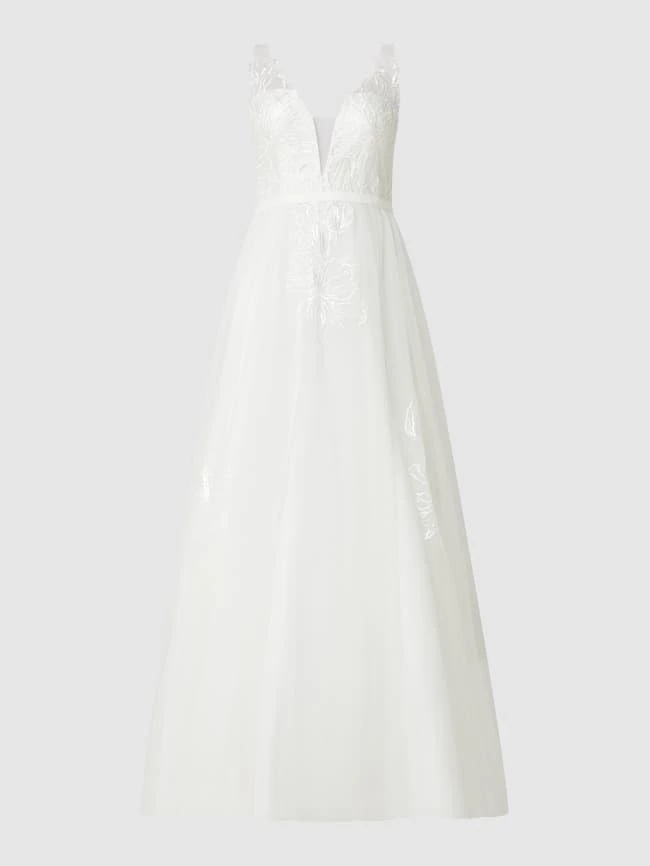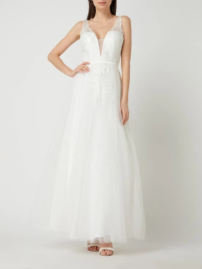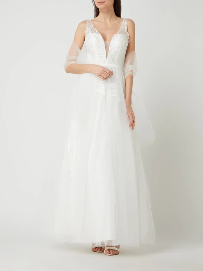 Das Brautkleid von unique ist aus Tüll gefertigt und tailliert geschnitten. Es kommt mit floralen Stickereien, Herz-Ausschnitt und mehrlagigem Rockteil.