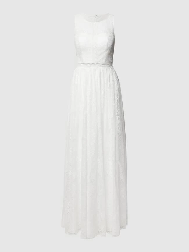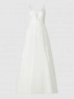 Das Brautkleid von unique ist aus strapazierfähigem Material gefertigt und tailliert geschnitten. Es kommt mit floraler Spitze, semitransparenten Einsätzen und Rundhalsausschnitt.