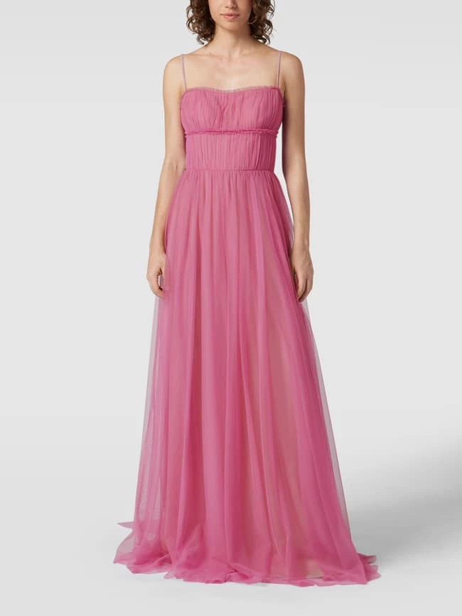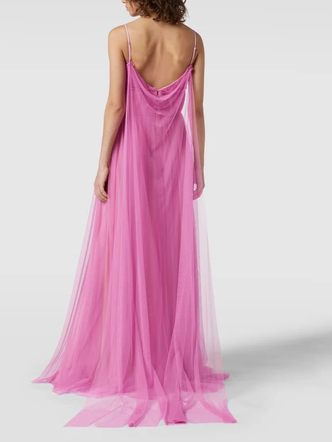 Das Abendkleid von Vera Wang ist aus strapazierfähigem Material gefertigt und tailliert geschnitten. Es kommt aus Tüll mit Herz-Ausschnitt, Spaghettiträgern und abnehmbarer Schleppe.